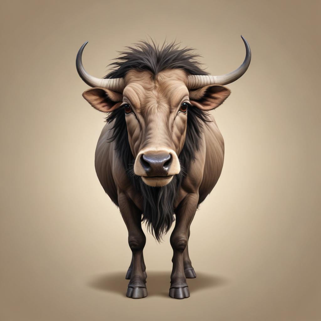 A bull stands in front of a plain background, showing its strong features. The animal has a thick beard and prominent horns.