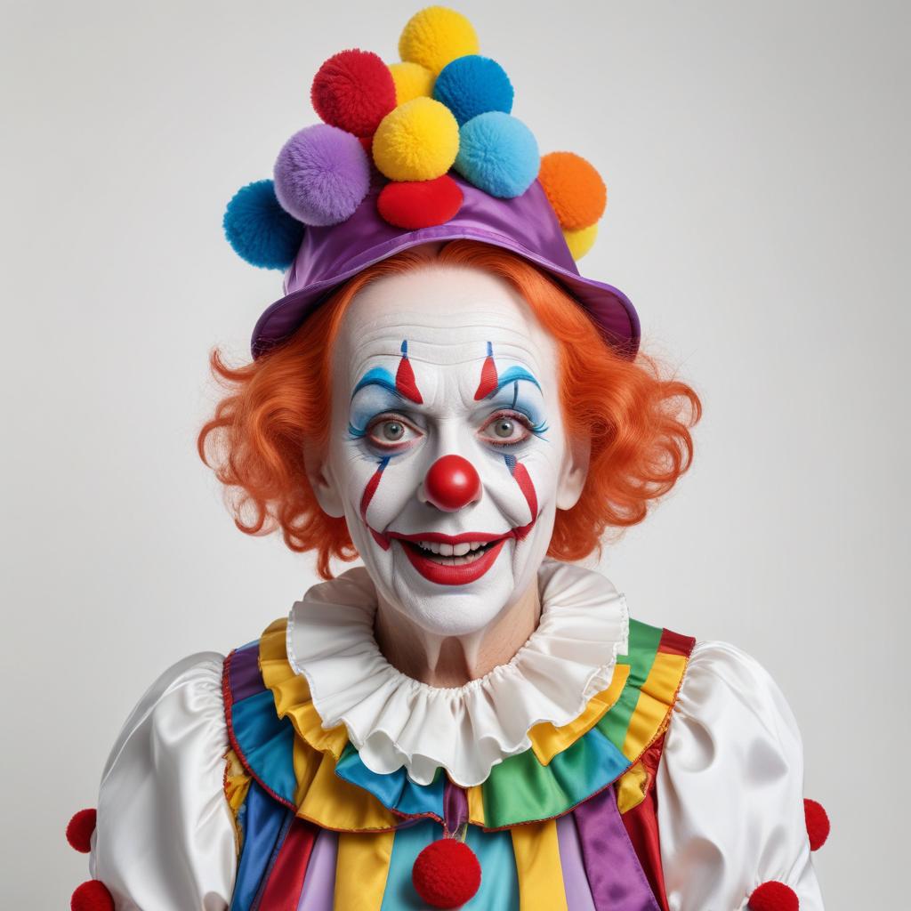 accessories, cheerful, circus, clown, colorful, costume, entertainment, face paint, festival, fun, hat, joy, laughter, makeup, party, performance, pom-poms, posing, smile, wig