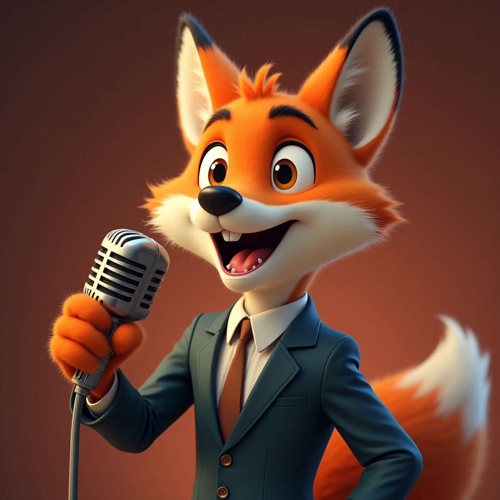 A cartoon fox stands on stage holding a microphone, dressed in a suit. The setting seems to be a performance area, bright and engaging.
