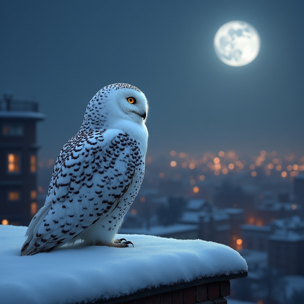A snowy owl sits on a rooftop covered in snow. The moon shines brightly as city lights glow in the background.