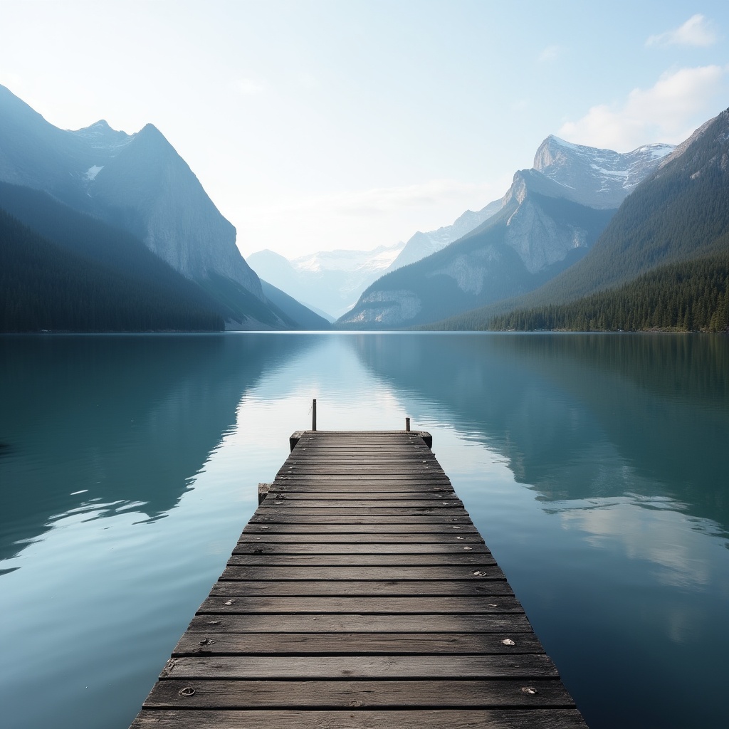 A dock stretches over still water, surrounded by mountains and trees. The scene captures the clear sky and serene landscape.