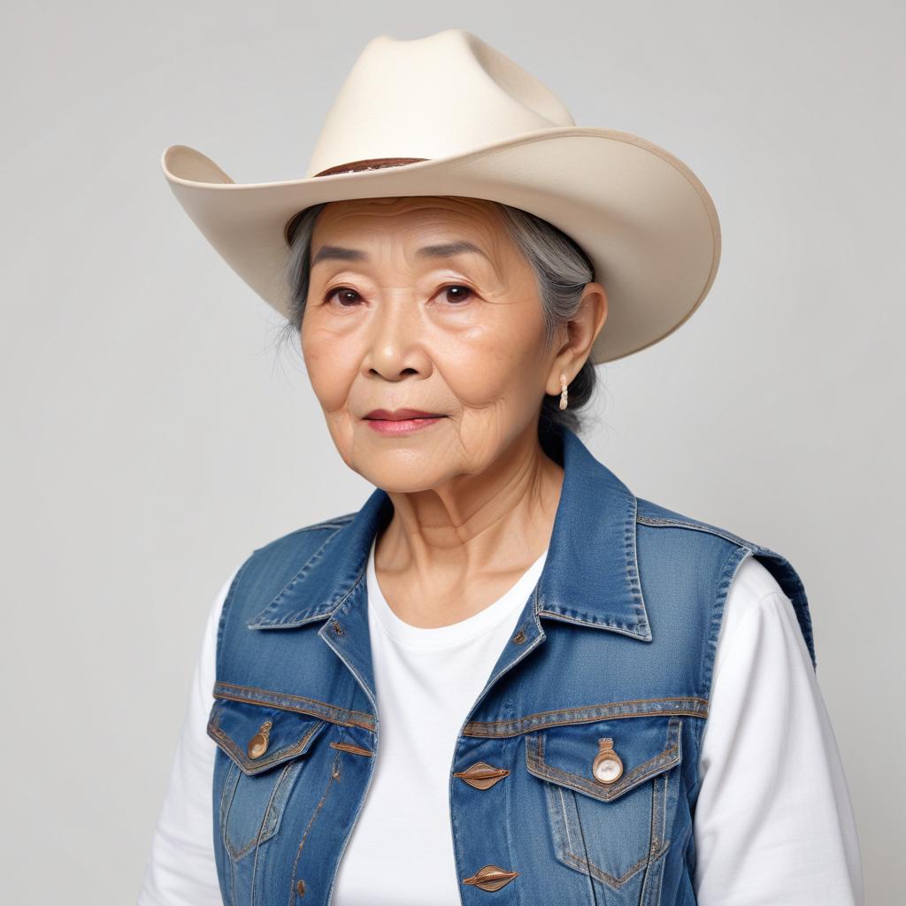 A senior woman wears a cowboy hat and denim vest while posing against a plain background. She shows a serious expression and confidence.