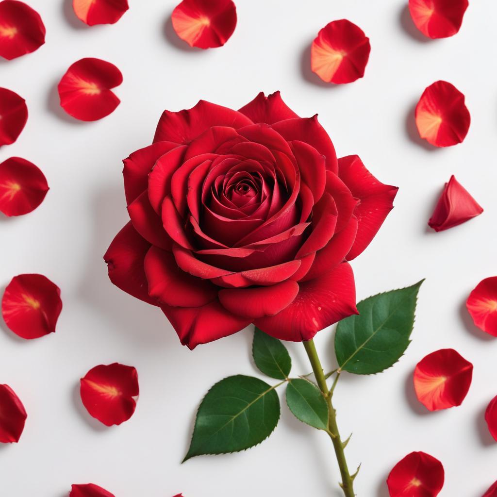 A red rose sits in the center surrounded by scattered rose petals on a white surface. The arrangement is simple and visually striking.