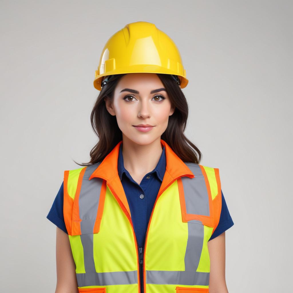 apparel, construction, construction site, direct gaze, female, gray, hard hat, industry, labor, orange, plain background, posing, professional, safety, uniform, vest, woman, work, workers, yellow