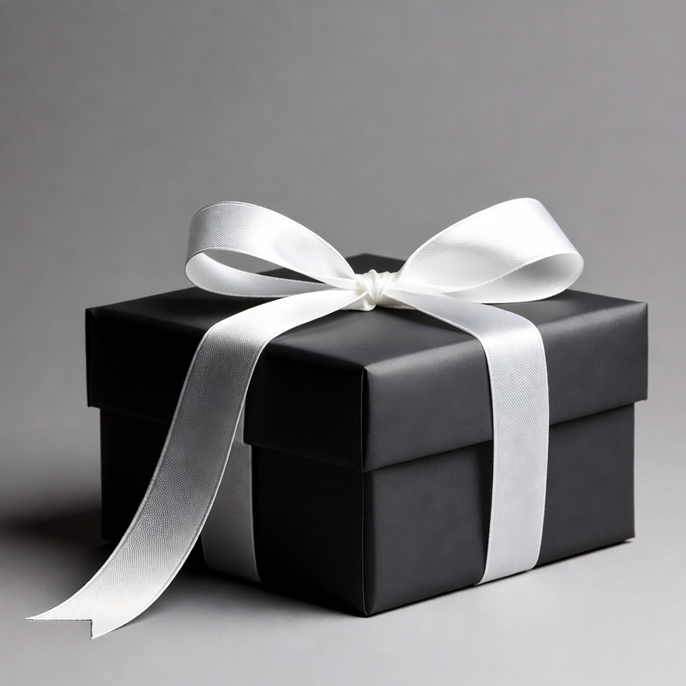 A black gift box sits on a gray surface, tied with a white ribbon. Light casts subtle shadows around the box.