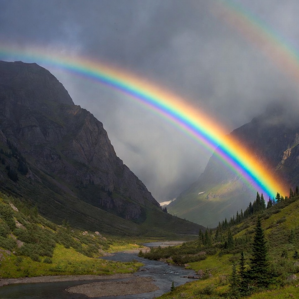 bright, clouds, colors, hike, hills, landscape, mountain, nature, outdoors, rainbow, river, scenic, sky, storm, sunlight, trees, valley, water, weather, wilderness