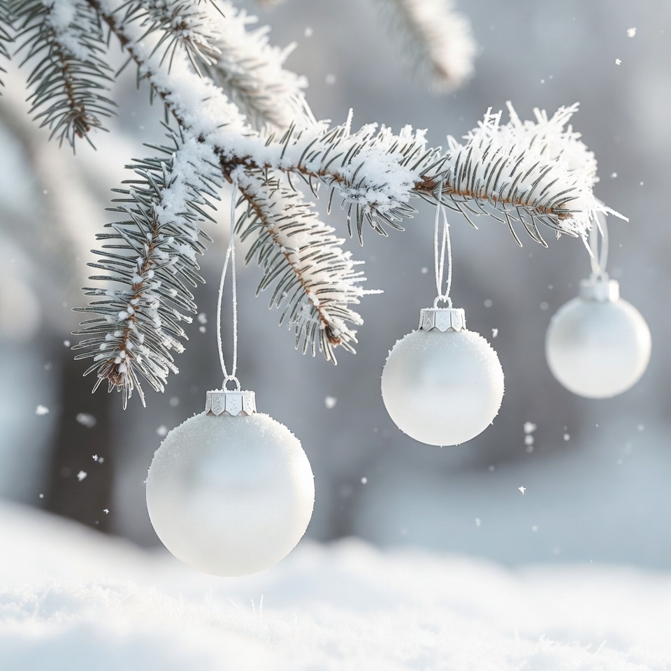 White ornaments hang from a snow-covered pine branch. Snow falls softly in the background. It is winter and a festive mood is present.
