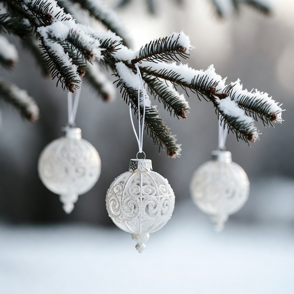 Three white ornaments dangle from snowy pine branches during winter. The scene shows a cold, festive atmosphere with snow-covered trees.