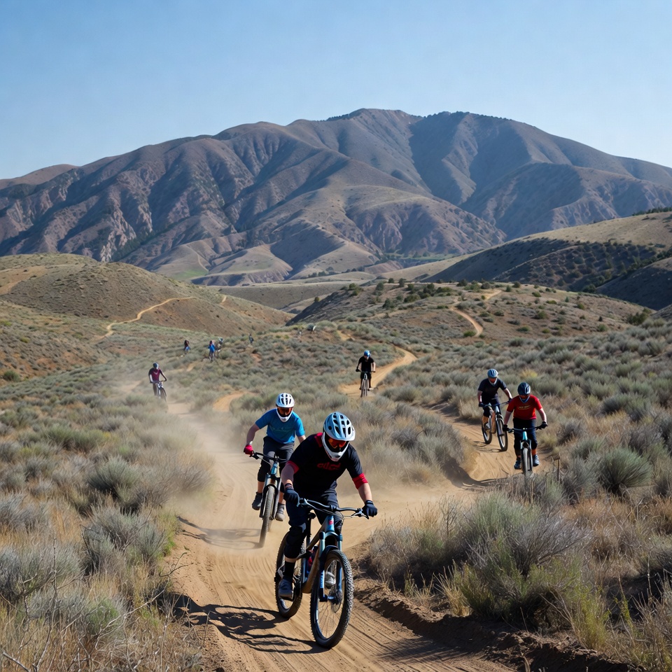 A group of mountain bikers rides on dirt trails through hilly terrain. The sun shines brightly as they create dust clouds in the dry landscape.