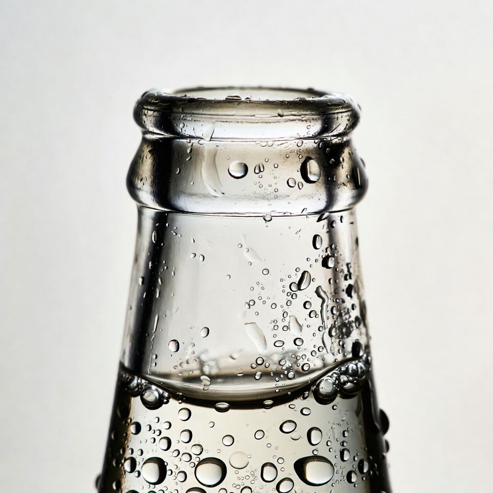 Water droplets cover a glass bottle. Light reflects off the surface. The background is plain. This scene captures a moment of hydration.