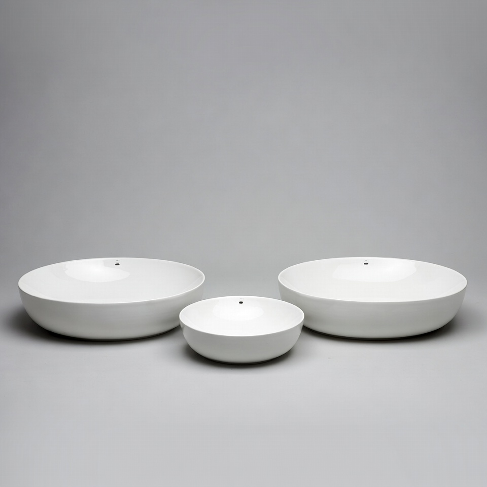 White ceramic bowls arranged in a line
