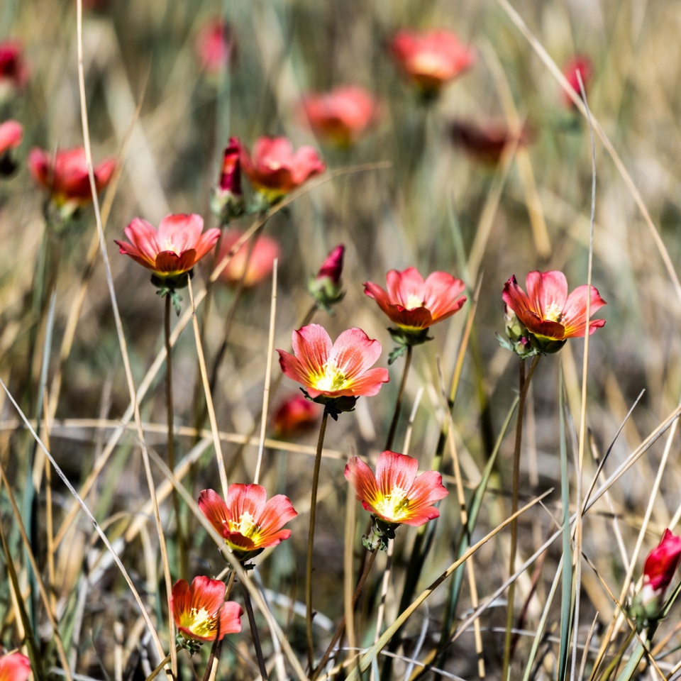 Bright red flowers bloom in a sunny field surrounded by dry grass on a warm day in late spring.
