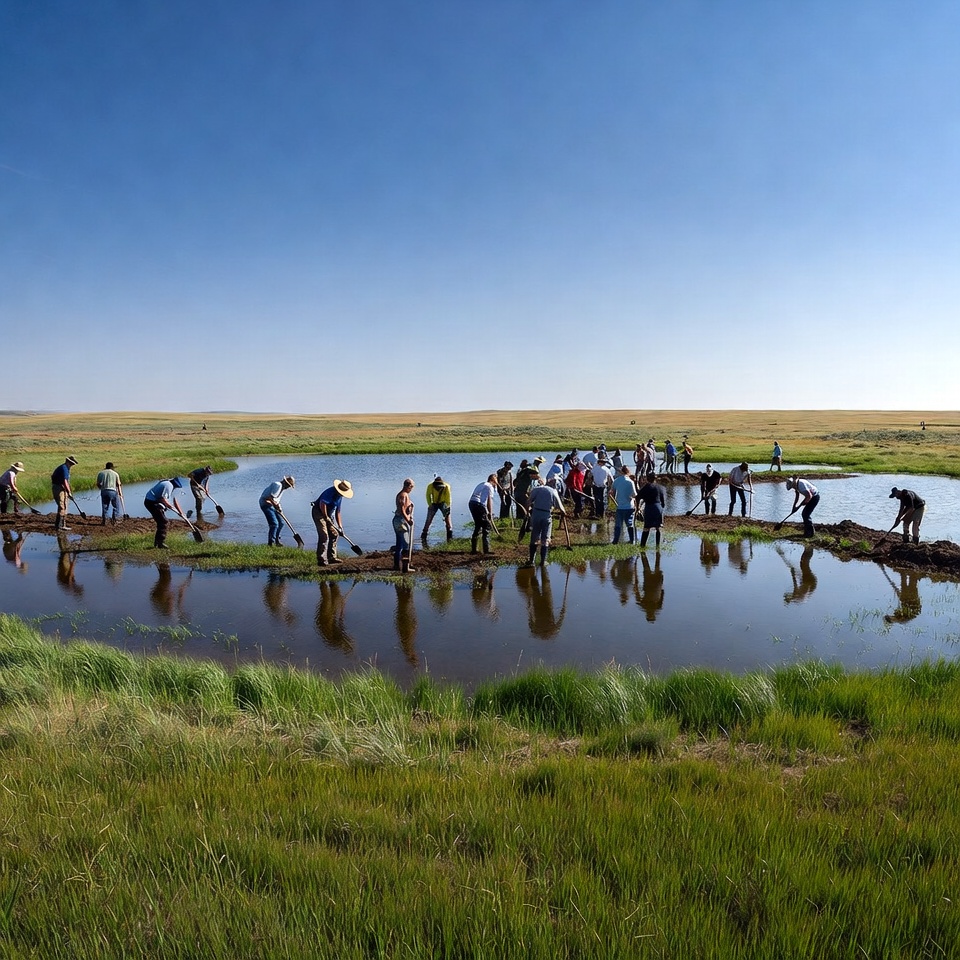 Groups of people work together in a waterlogged field. They are planting crops in wet soil under a clear blue sky during the day.