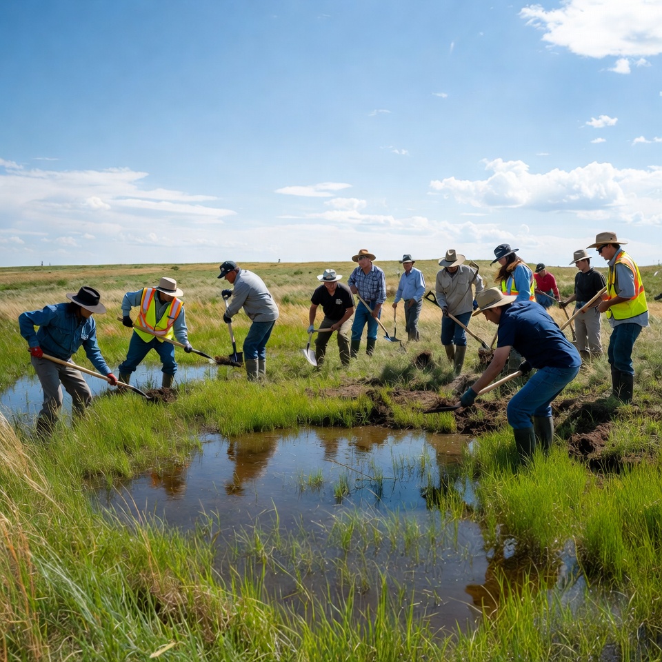 activity, clear sky, community, digging, effort, environmental, grass, group, landscape, nature, outdoors, people, planting, project, restoration, soil, teamwork, volunteers, water source, wetland