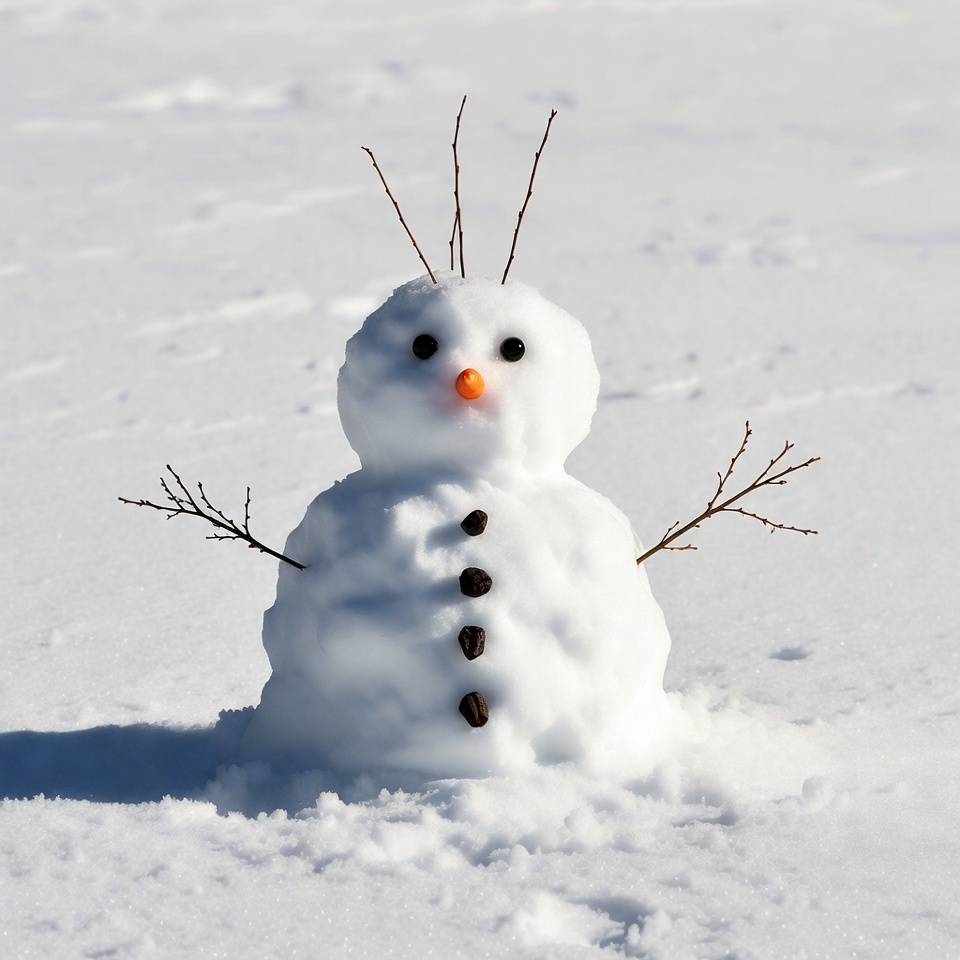 A snowman stands in a snowy field. It has a carrot nose, button eyes, and stick arms. The scene shows a clear winter day.