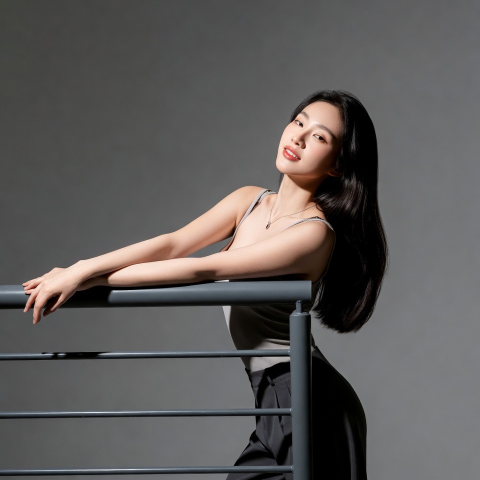 A model stands beside a metal railing in a studio setting. She is wearing a simple outfit and has long hair flowing down.