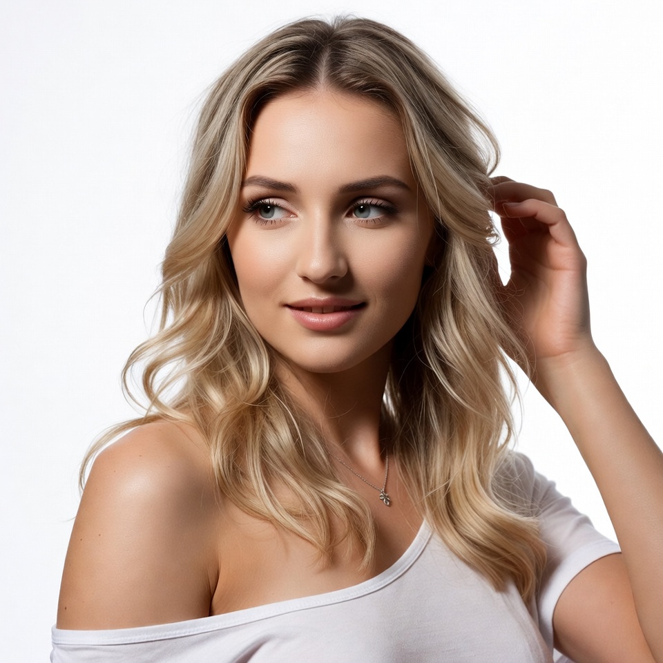 Young woman with wavy hair poses in a studio. She touches her hair and gazes into the camera with a slight smile.