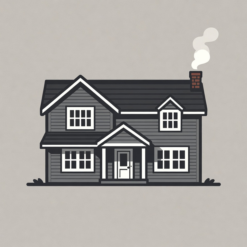 A house stands with a chimney releasing smoke. The design is simple with windows and a door, set against a light background.