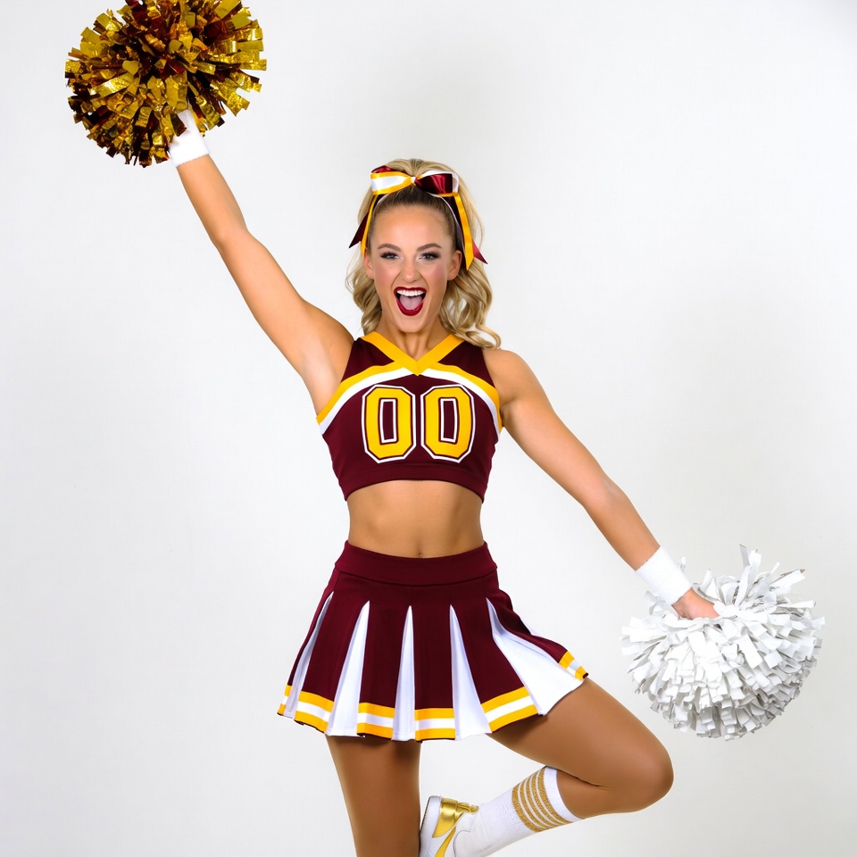 Cheerleader is posing and smiling while holding pom poms high. She wears a uniform with colors and shows enthusiasm for the sport.