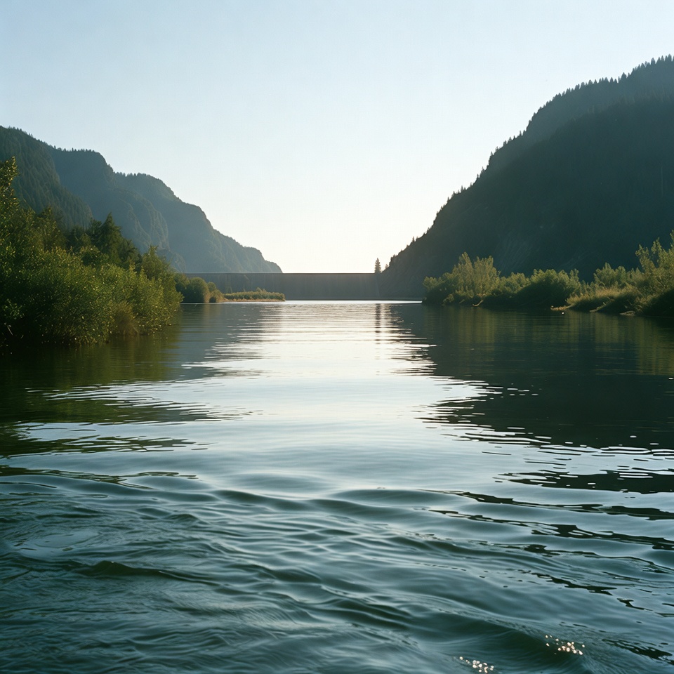 Calm river flows between green hills. Water reflects the light as the sun sets in the background. Nature showcases its beauty during evening hours.