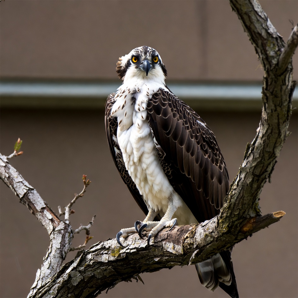 An osprey sits on a tree branch, observing its surroundings. The bird is positioned against a muted background and showcases its feathers.