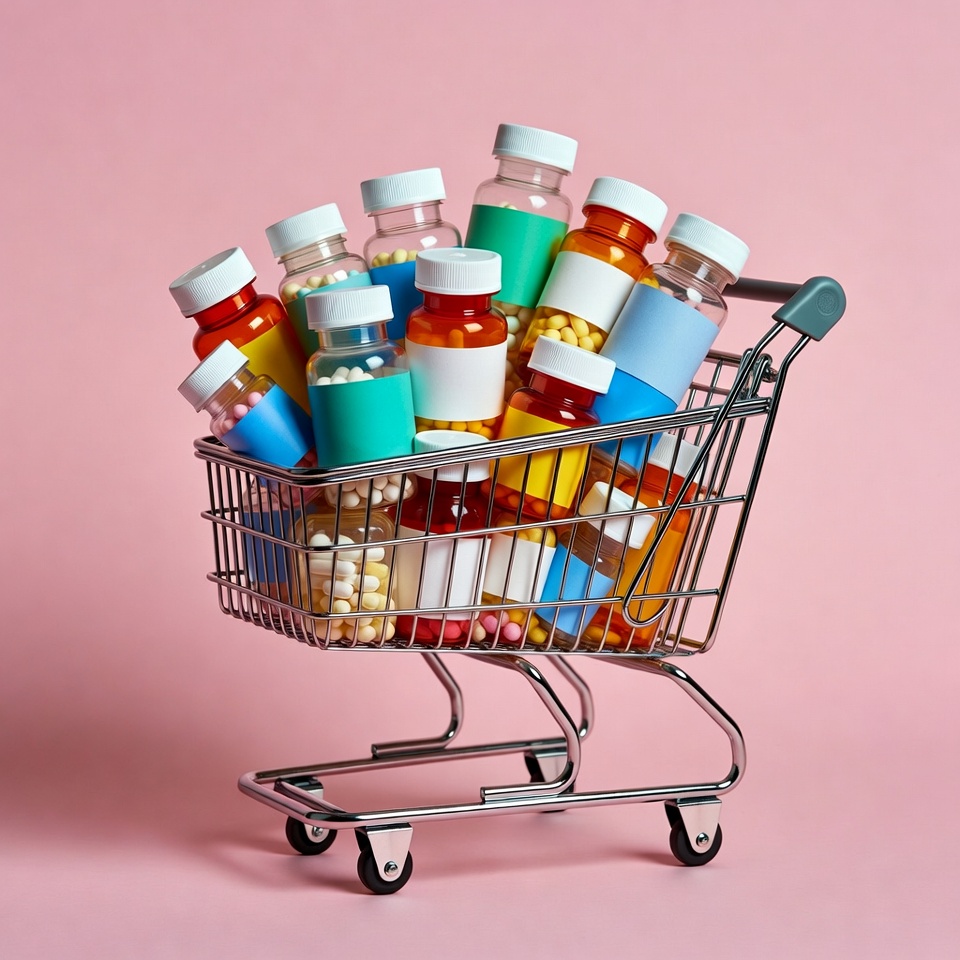 A shopping cart contains various bottles of medicine placed against a pink background. Some bottles have colorful labels and caps.