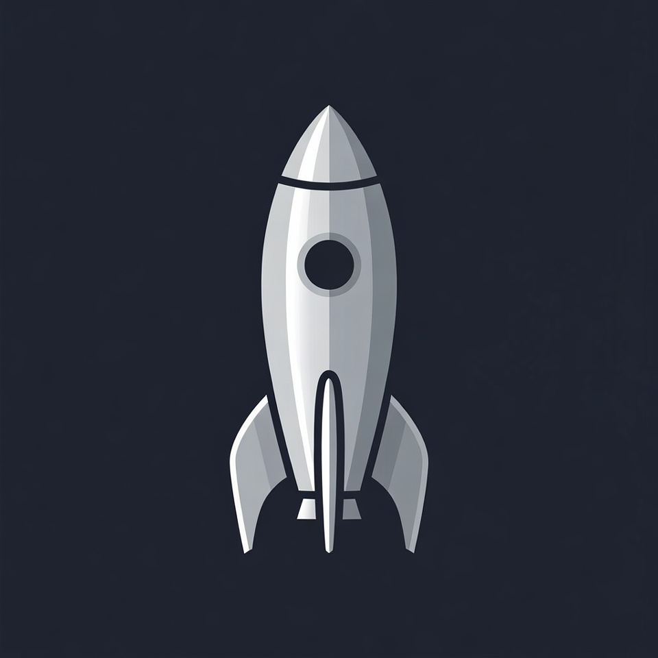 A silver rocket stands upright on a dark background. It is ready to launch into the atmosphere and explore space.