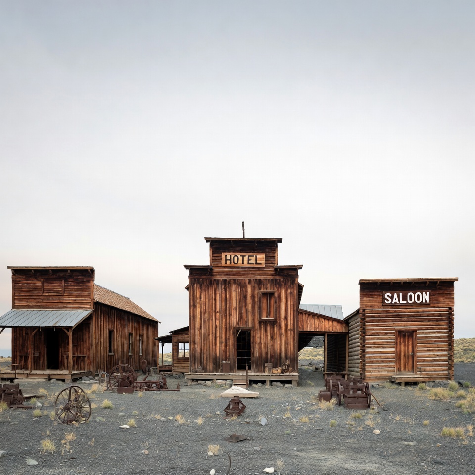Old wooden buildings stand in a ghost town. Some are labeled hotel and saloon. The area is dry and rocky with little vegetation.