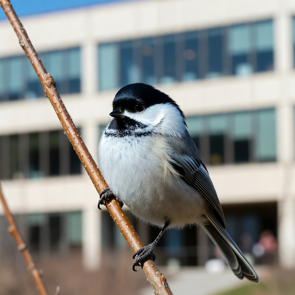 A small bird sits on a thin branch in front of a modern building. Sunlight shines on the scene during daytime.