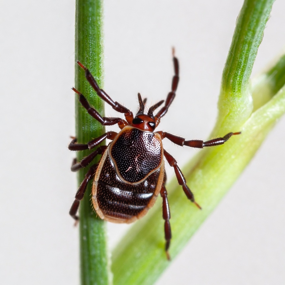 A tick crawls on a green leaf, showing its body details. The picture highlights the insect's features and the plant it is on.