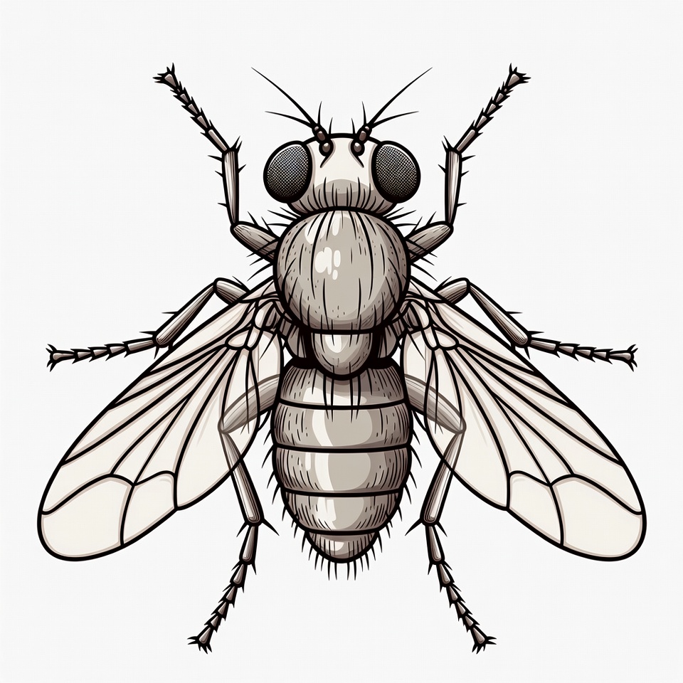 A black and white sketch shows a fly from a top view. The drawing highlights its body, wings, and legs with clear lines.