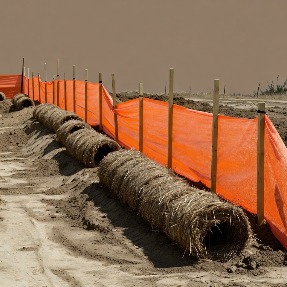 agriculture, construction, dirt, erosion control, farming, fencing, field, ground work, hay bales, land management, landscape, natural materials, orange fencing, orange mesh, project, rural area, safety barriers, site preparation, soil, straw bales