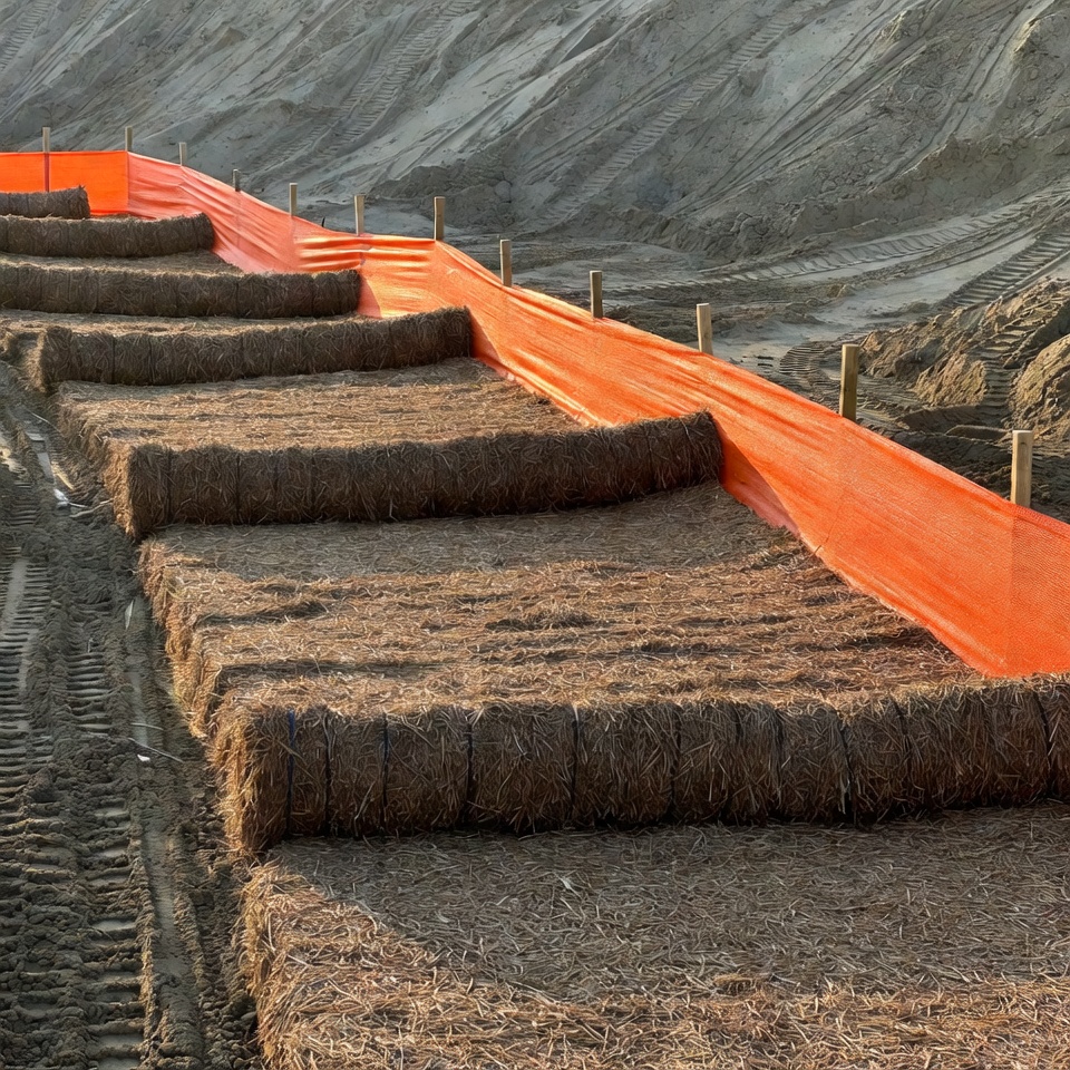 Workers arranged straw bales on a construction site. An orange fence lines the area, showing ongoing work during the day.