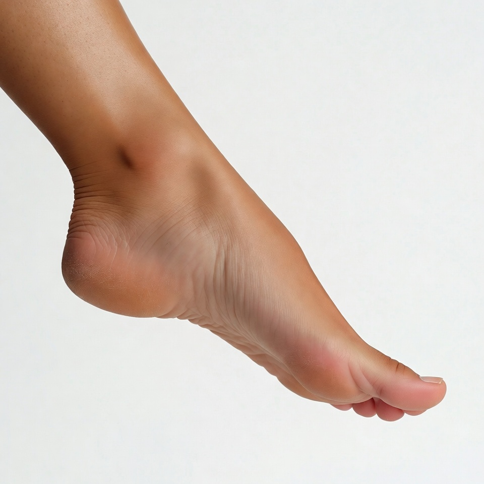 A foot is positioned on a light background during daylight. The toes are slightly curled, showcasing the sole.