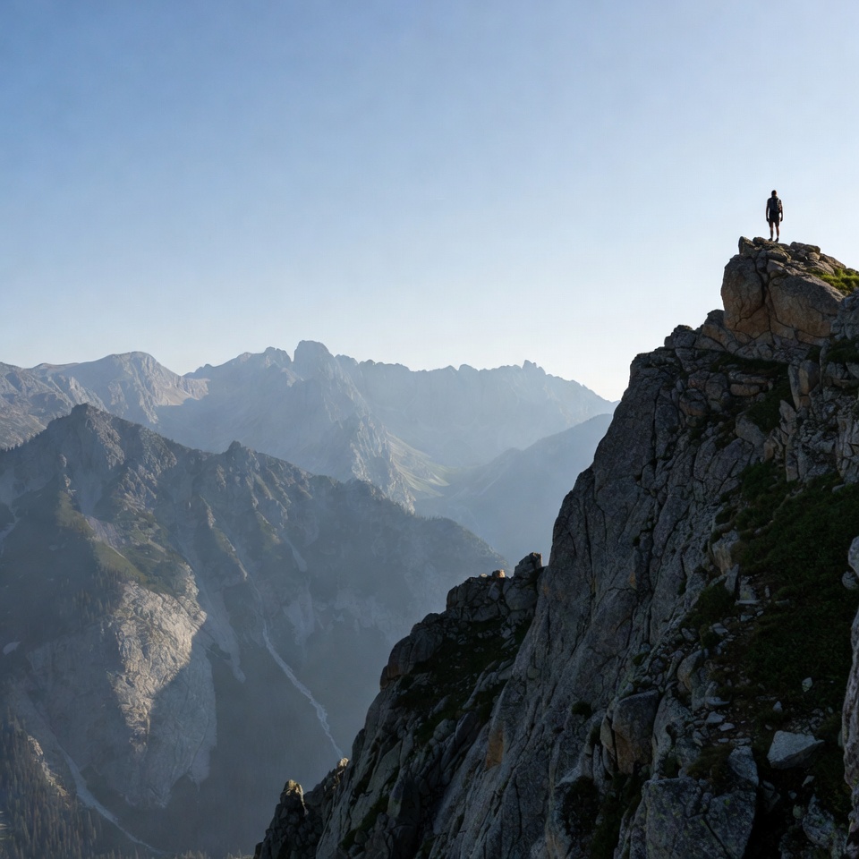 A hiker stands on a rocky peak during sunset, overlooking vast mountain ranges and valleys in the background with clear skies.