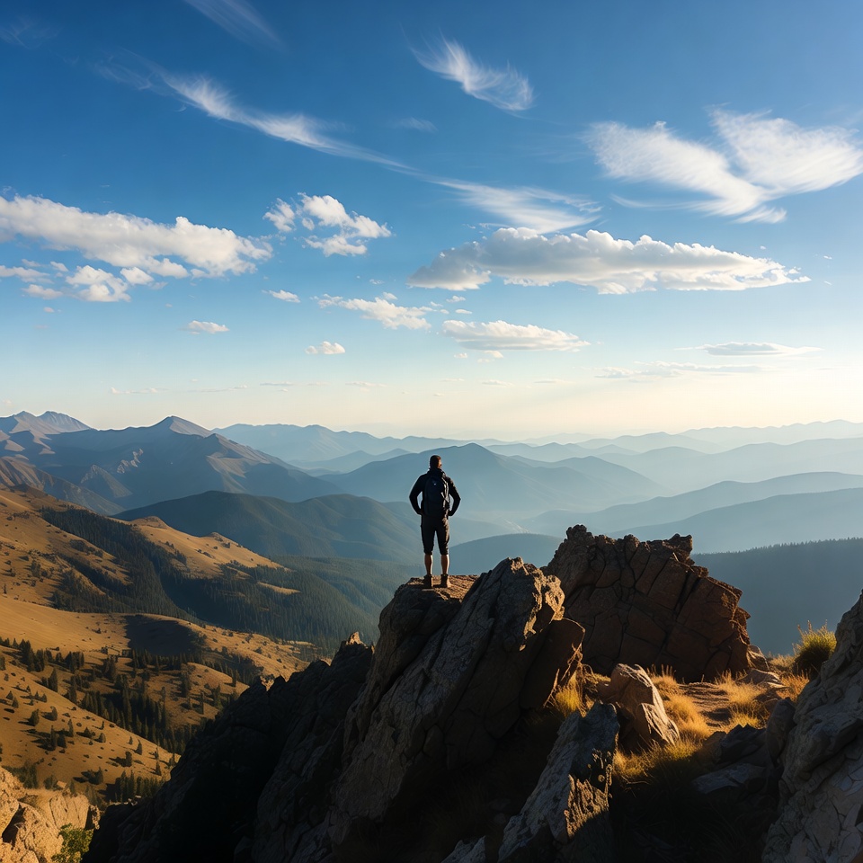 A person stands on a rocky summit, overlooking vast rolling hills and mountains during late afternoon. Clouds drift across the sky.