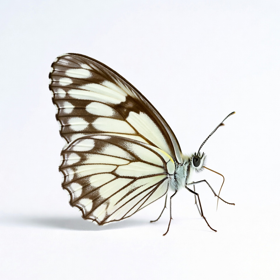 A butterfly rests on a white surface. Its wings display a pattern of brown and white colors. The insect appears still and calm.