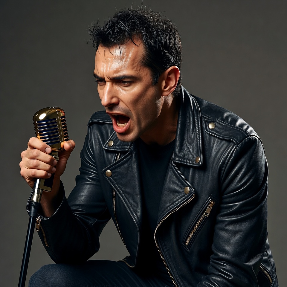 A man sings passionately into a microphone while wearing a leather jacket. Bright lights shine from behind him, creating a dynamic atmosphere.