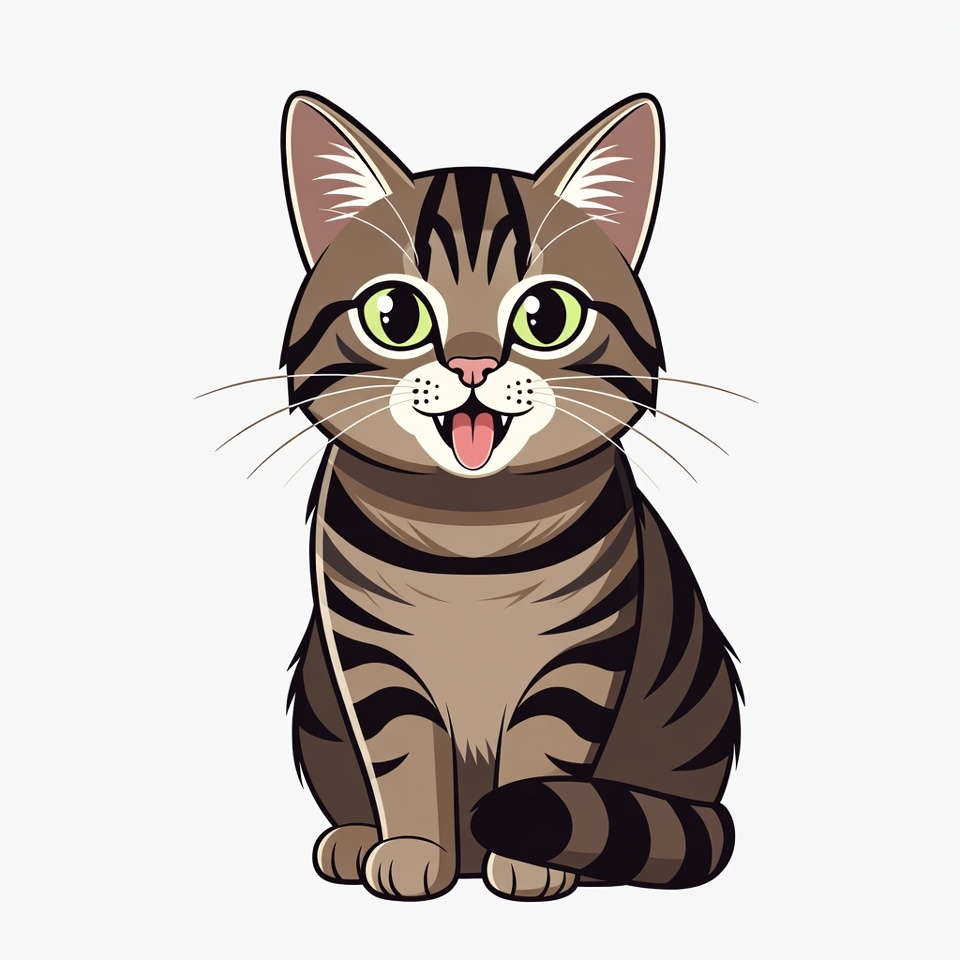 A cartoon tabby cat sits with a happy expression, showing its tongue. The cat has green eyes and brown stripes on its fur.