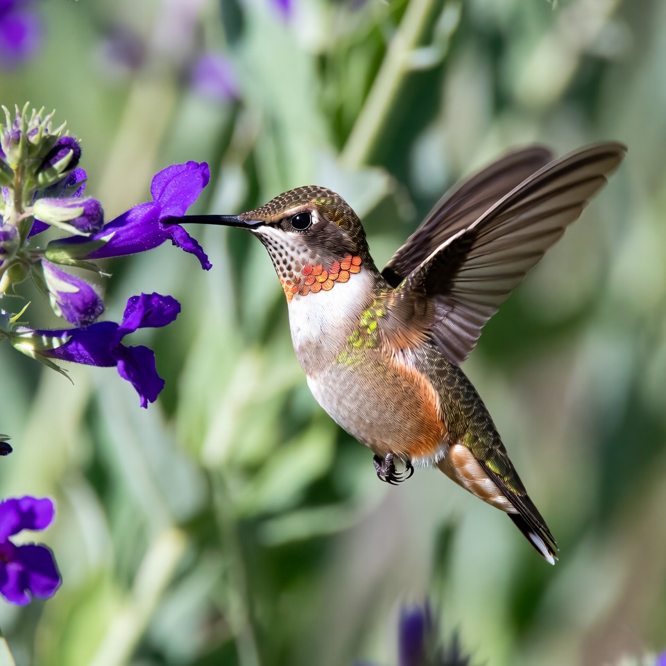 Hummingbird feeding on purple flowers