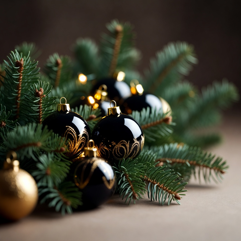 Black and gold ornaments rest on green pine branches, creating a simple holiday scene with soft lighting and warm colors.