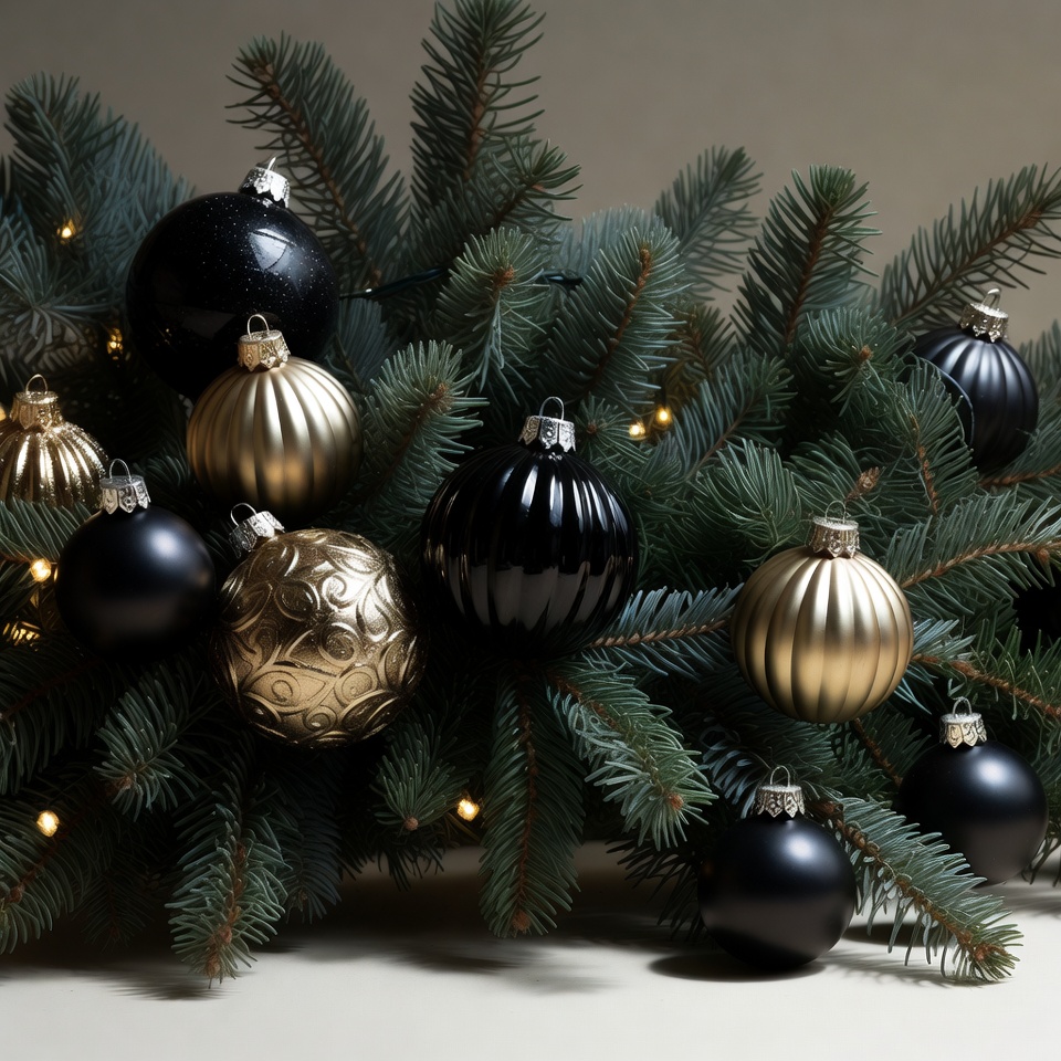 Decorative black and gold ornaments hang from green pine branches. Soft lights add a warm glow to the festive arrangement.
