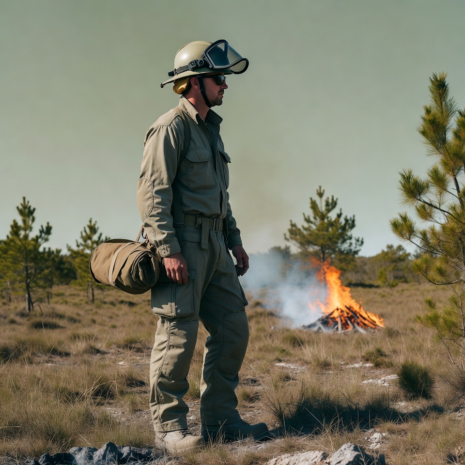 Firefighter stands in a grassy area near a controlled burn. Smoke rises from the fire as he observes the flames.
