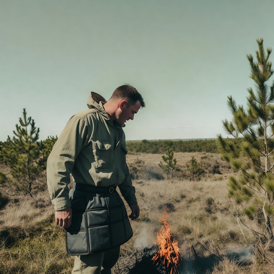 A man stands in a grassy area, overseeing a small fire among trees during the day. He wears a protective outfit, focused on the flames.