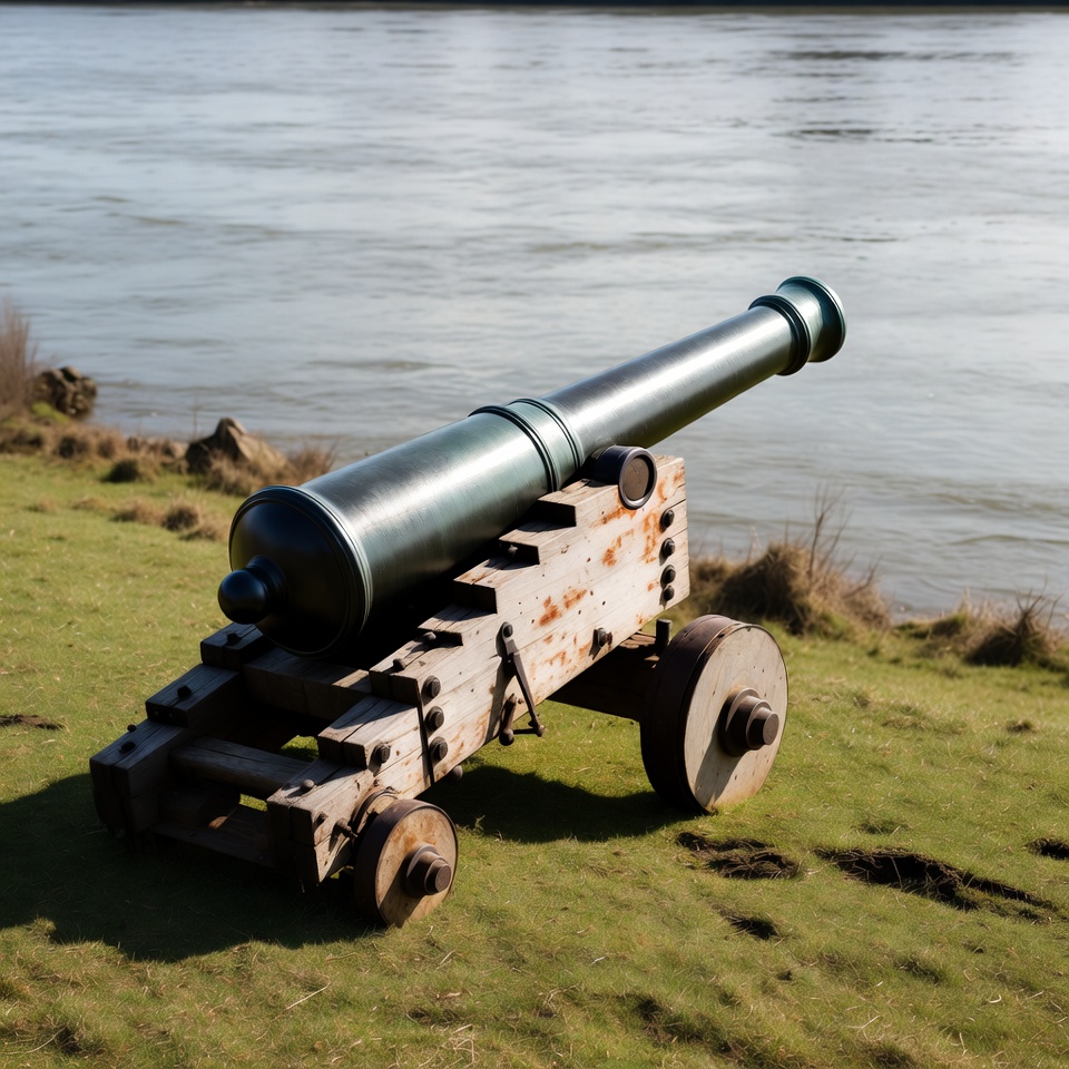 An old cannon sits on a wooden carriage near the river. The landscape is grassy and the water reflects sunlight.