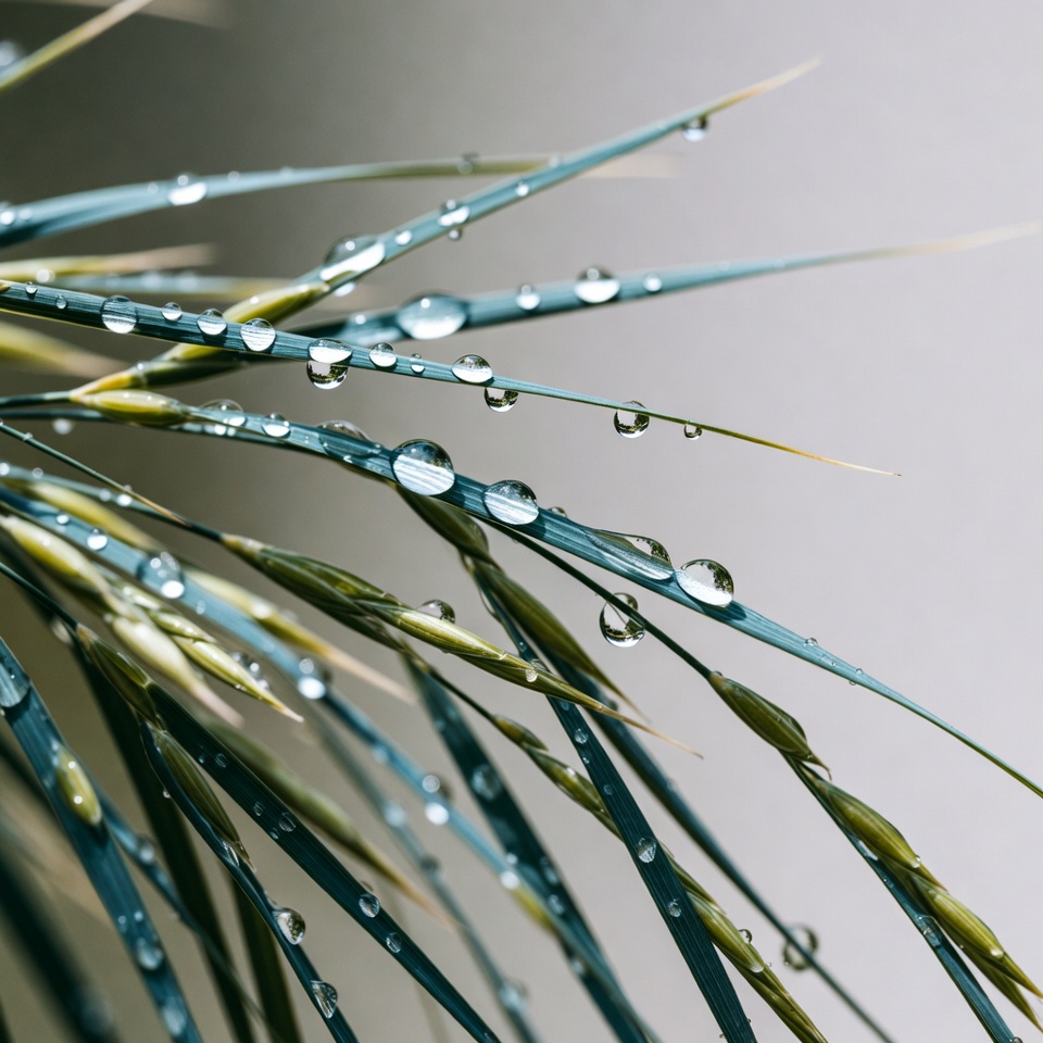 Water droplets rest on long green leaves, capturing light and life in a simple moment of nature. The background is soft and muted.