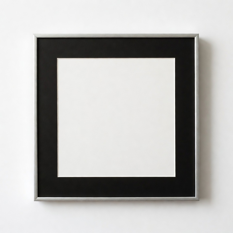 A square frame with a black mat sits on a white wall. The frame is simple and holds no picture inside.