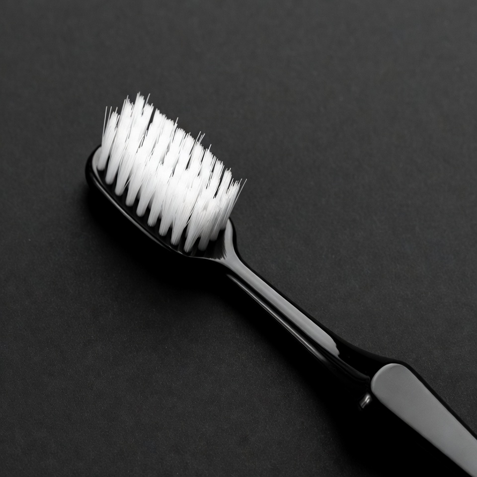 A black toothbrush with white bristles rests on a dark surface. The bristles are clean and arranged neatly.