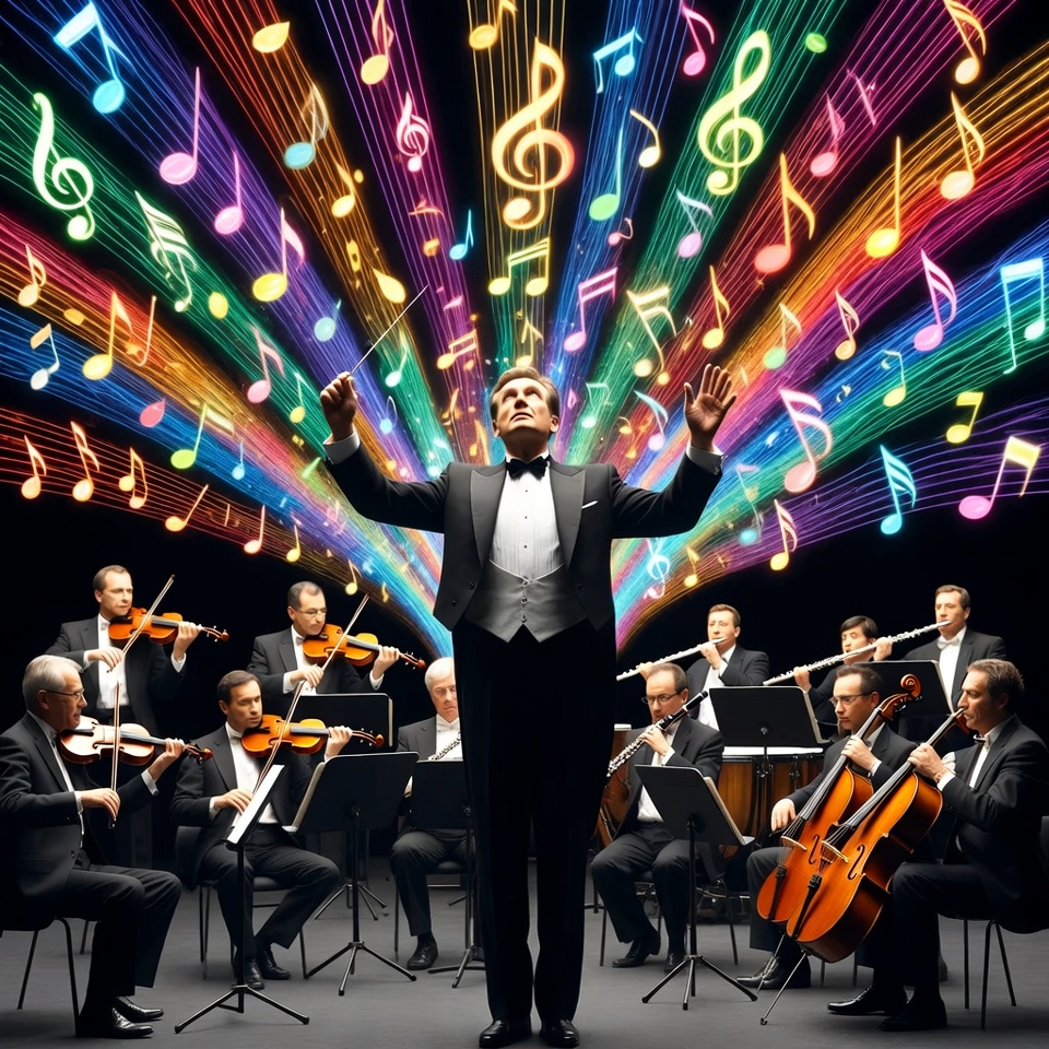 Musicians perform in a concert, with a conductor leading. Bright music notes burst around them, creating a lively atmosphere.