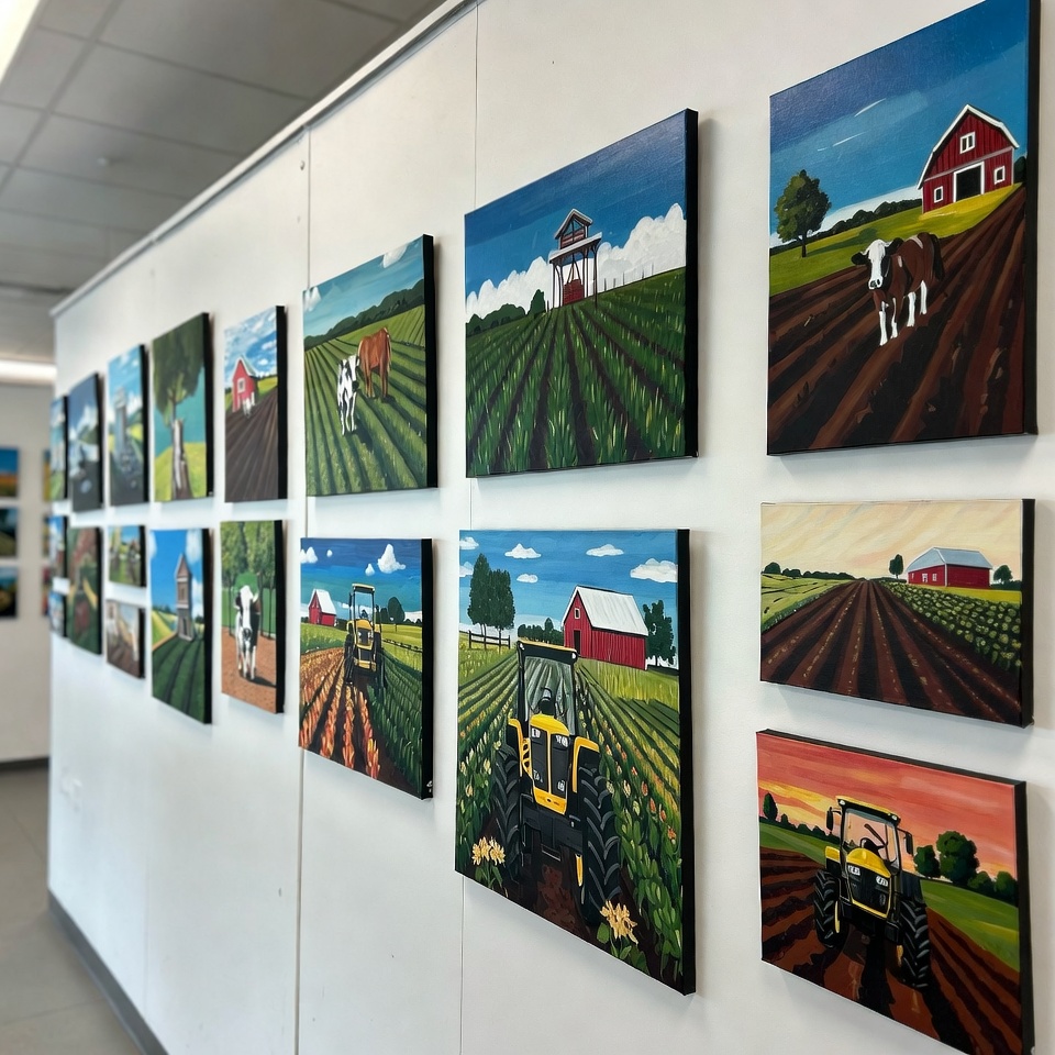 agriculture, art, artwork, barns, colorful, community center, cows, display, exhibition, farm, fields, indoor, landscape, local, nature, paintings, rural, rural life, tractors, wall